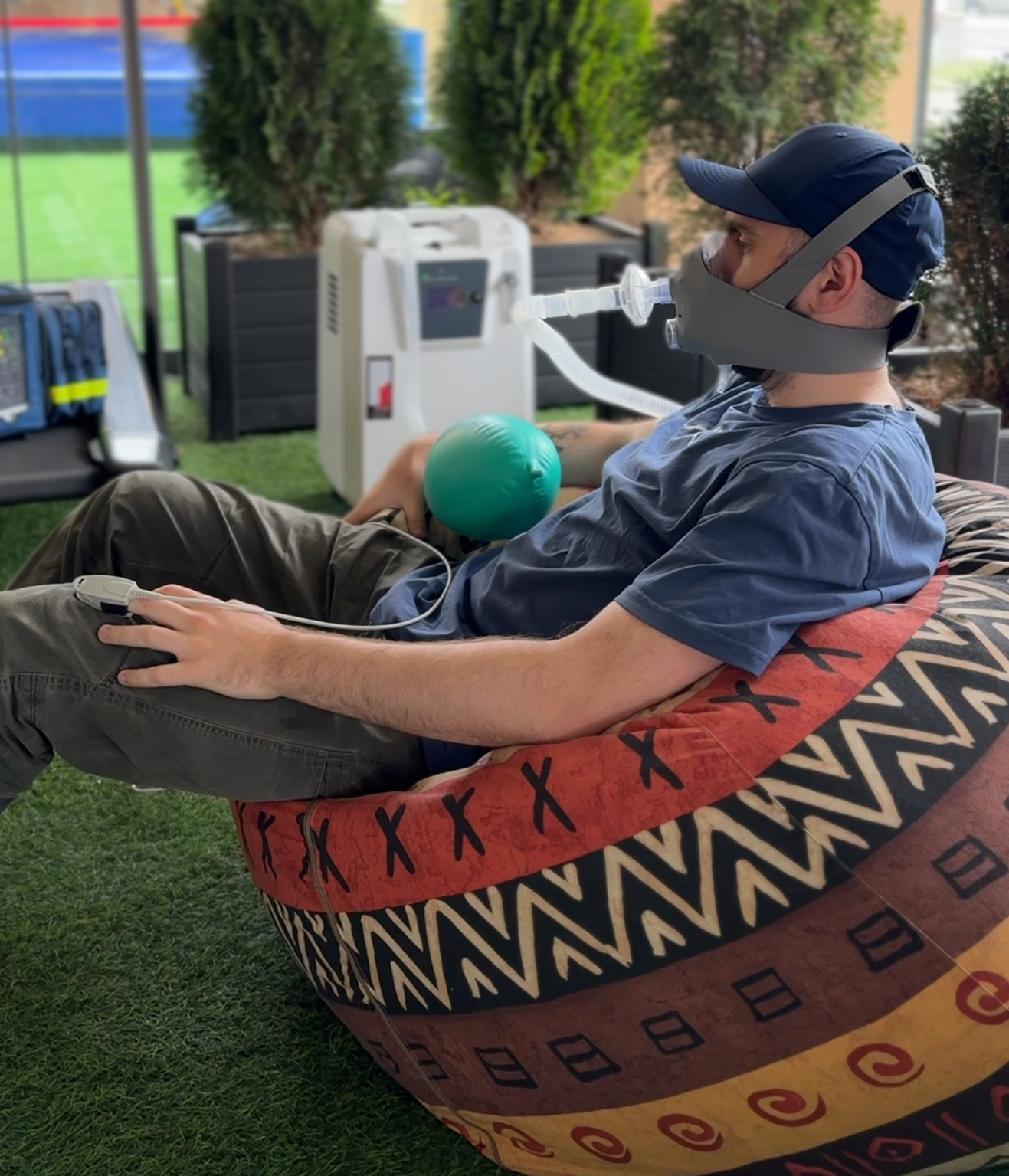 Пассивные тренировки — дыхание газовой смесью через маску в комфортном кресле на веранде нашего outdoor-центра.