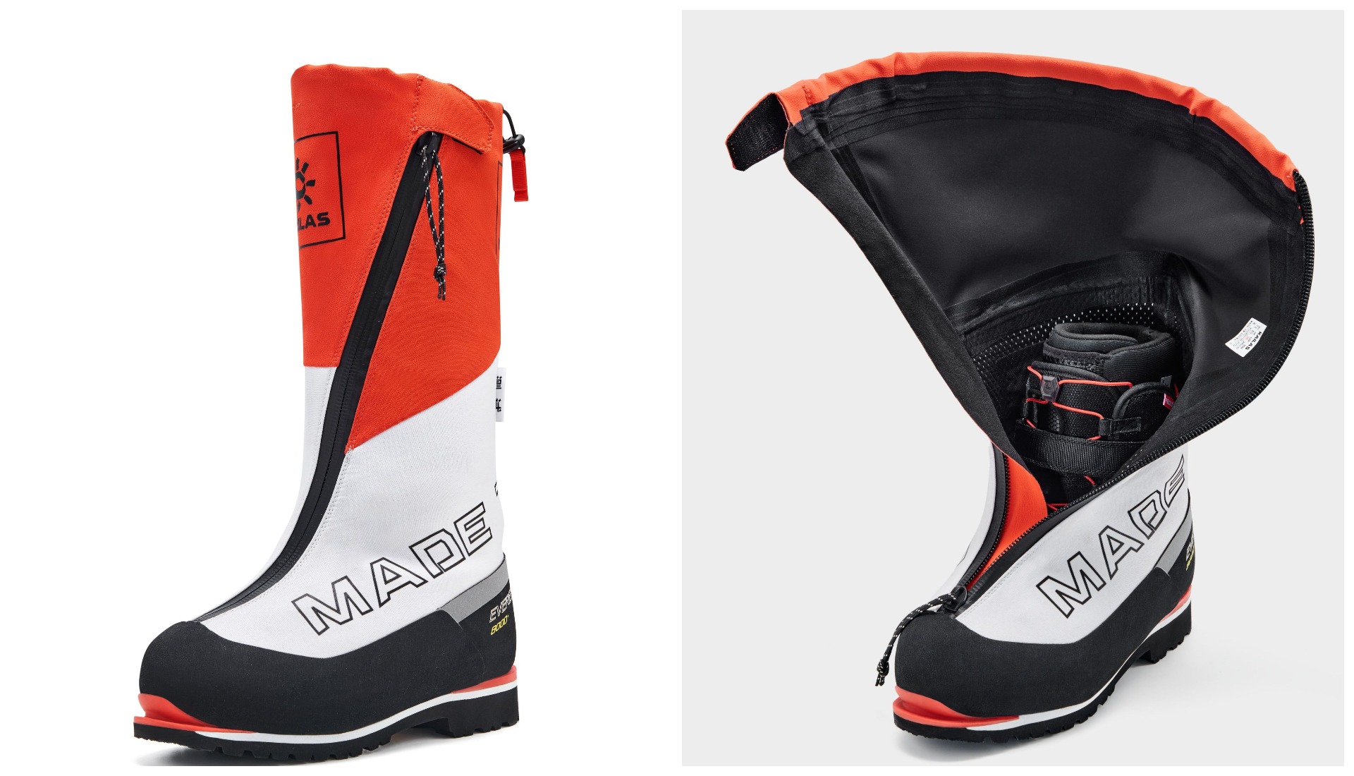 Модель состоит из трехслойной внешней, внутренней оболочки с системой быстрой шнуровки QFS и внутреннего сапожка. О нем стоит сказать подробнее: утеплённая подкладка из графена сохраняет тепло при -60°C, а аэрогель PrimaLoft на носке ‒ при -78°C. Вес в размере 42 ‒ всего 1,3 кг. Внешний ботинок широко раскрывается, а внутренний сапожок на липучке позволяет легко надевать и снимать обувь. Подошва Vibram Mont и Newflex разработана с учётом использования при экстремально низких температурах. Ботинки совместимы со всеми видами кошек. Напомним, что Kailas ‒ единственный бренд родом из Азии, выпускающий полный комплект экипировки для восхождений на высоту более 8 000 м.