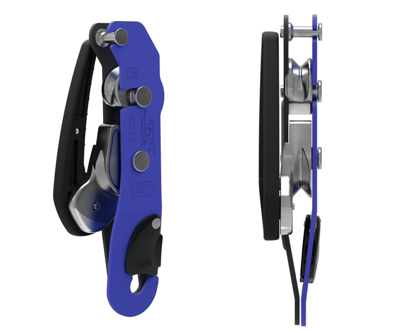 Petzl Stop на сегодняшний день — одно из самых популярных устройств среди спелеологов. Основные конструктивные элементы у него такие же, как у Petzl Simple, но он имеет подвижный несимметричный нижний валик, слитый с рукоятью. Благодаря этому, если отпустить рукоять во время спуска, валик (кулачок) перекашивается и прижимает верёвку к верхнему валику, тем самым останавливая спуск.